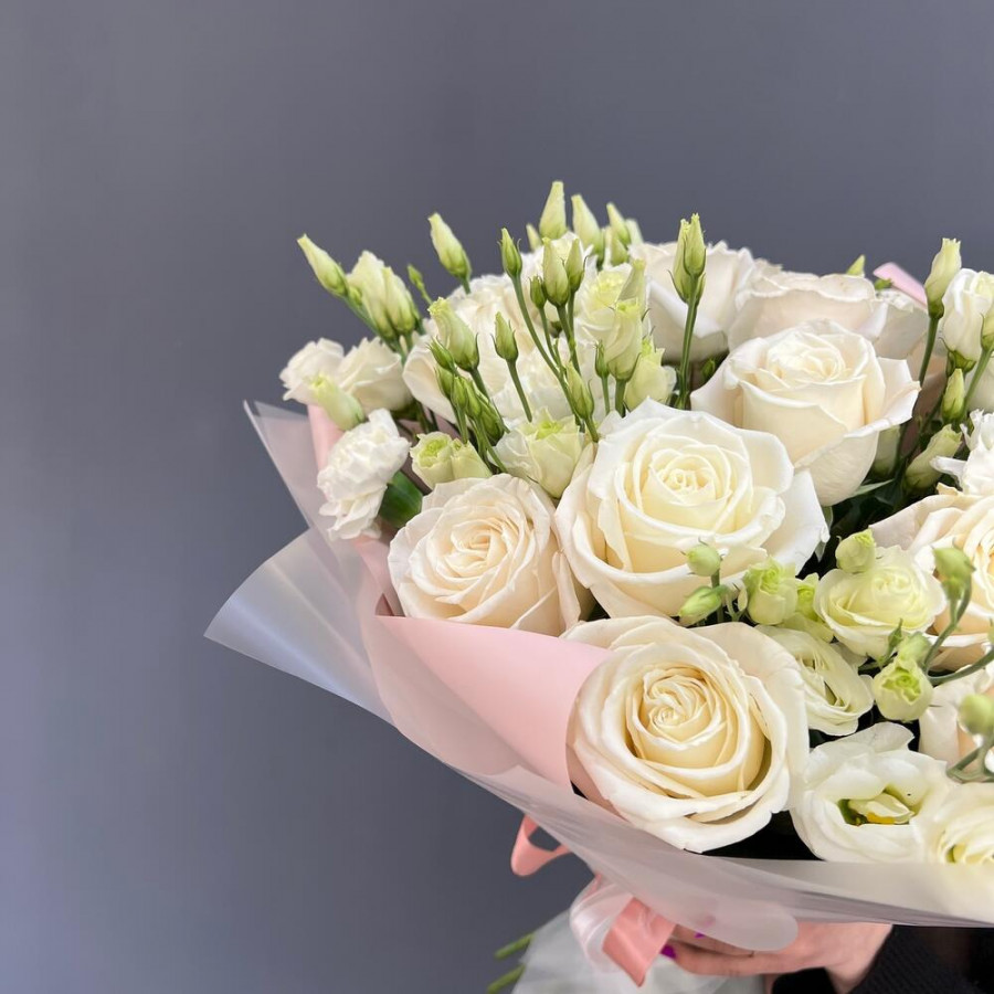 На фото букет «белый рассвет». В составе: роза 15 шт, эустома (лизиантус) 10 шт, дизайнерская упаковка 1 шт, атласная лента 1 шт, . Все цветы свежие и ароматные, букет красиво оформлен и отлично подходит для подарка. Доступна доставка цветов или самовывоз.
