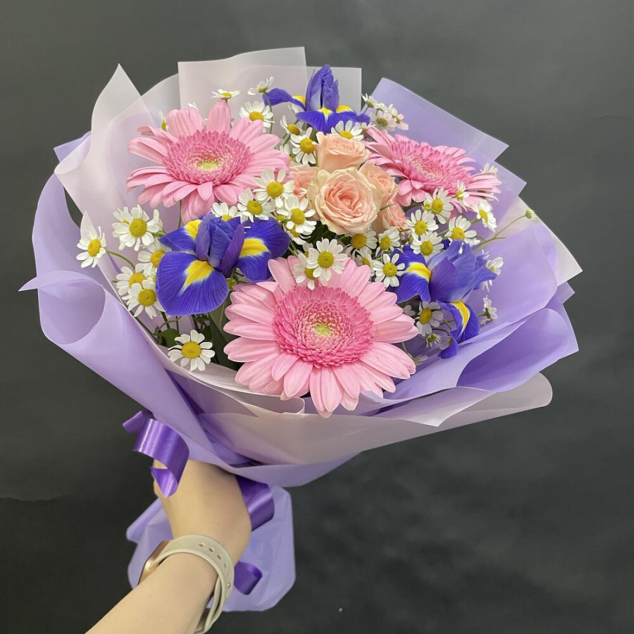 На фото букет «лиловый конфетти». В составе: ирис 3 шт, кустовая роза 1 шт, танацетум 3 шт, гербера 3 шт, дизайнерская упаковка 1 шт, атласная лента 1 шт, . Все цветы свежие и ароматные, букет красиво оформлен и отлично подходит для подарка. Доступна доставка цветов или самовывоз.